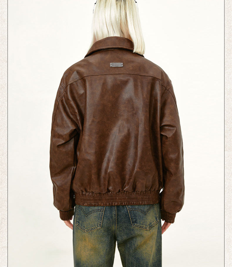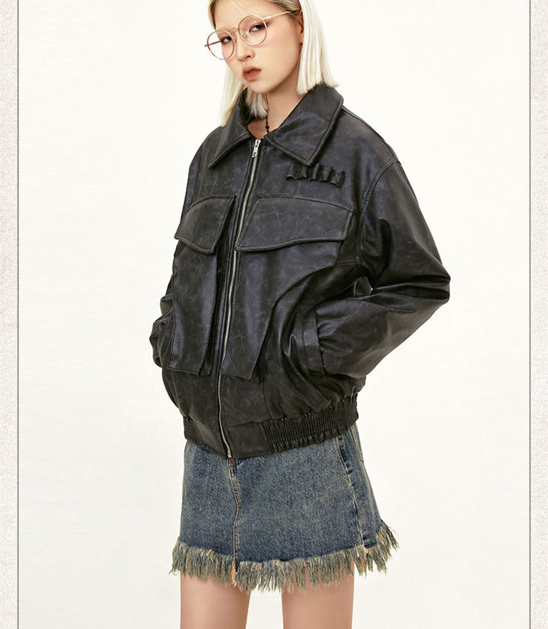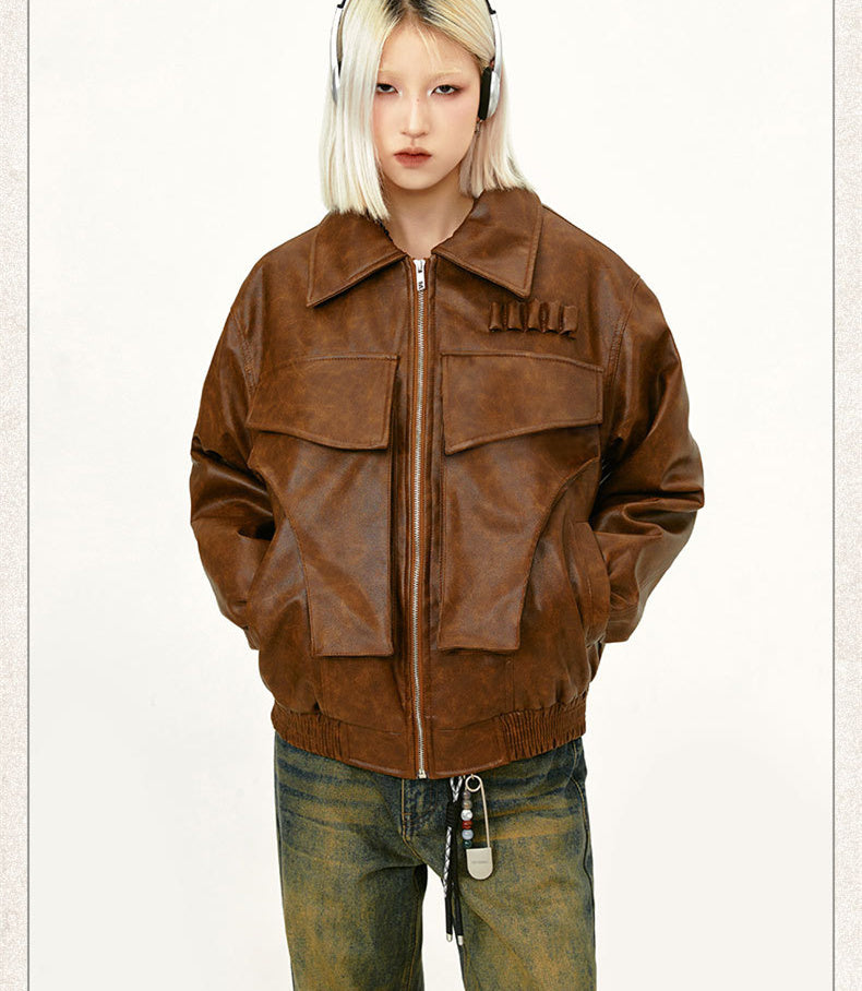 American Street Retro Large Pocket Lapels PU Leather Coat