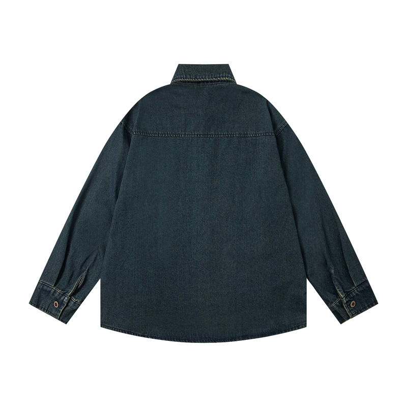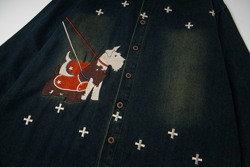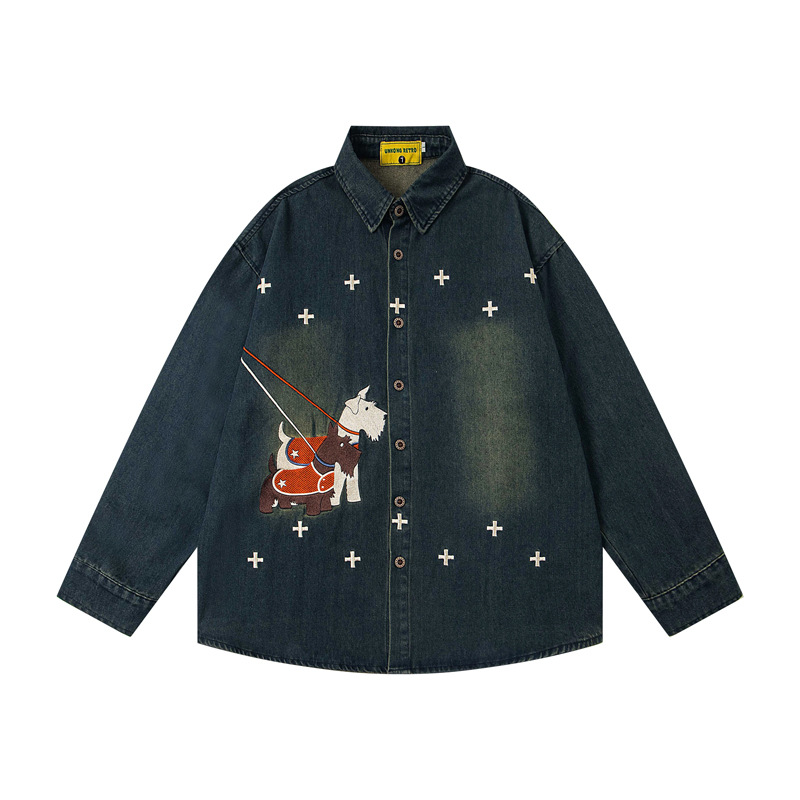 Retro Dog Embroidery Washed Denim Long Sleeve Shirt For Men And Women | MuddyStock Originals