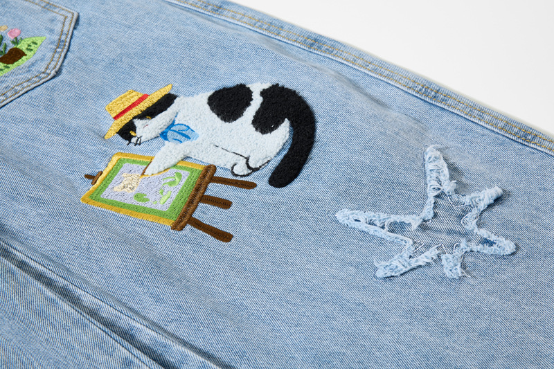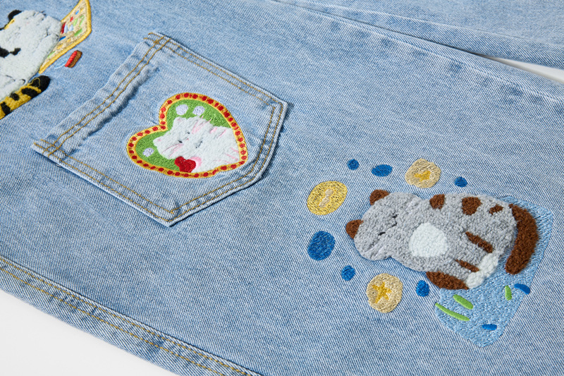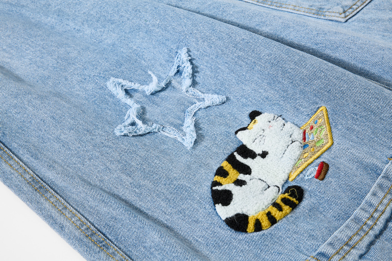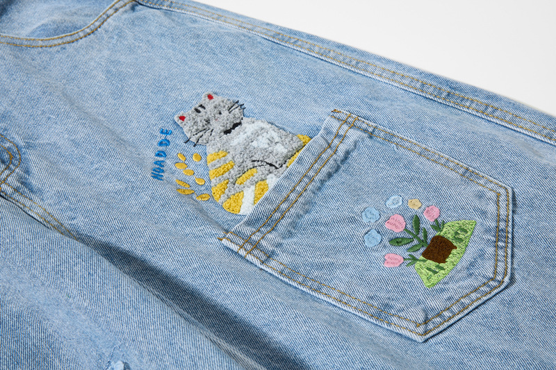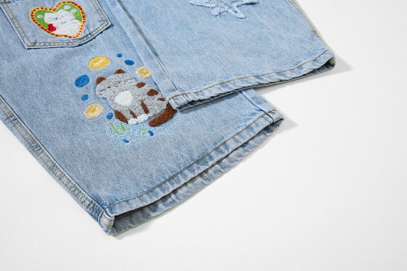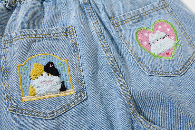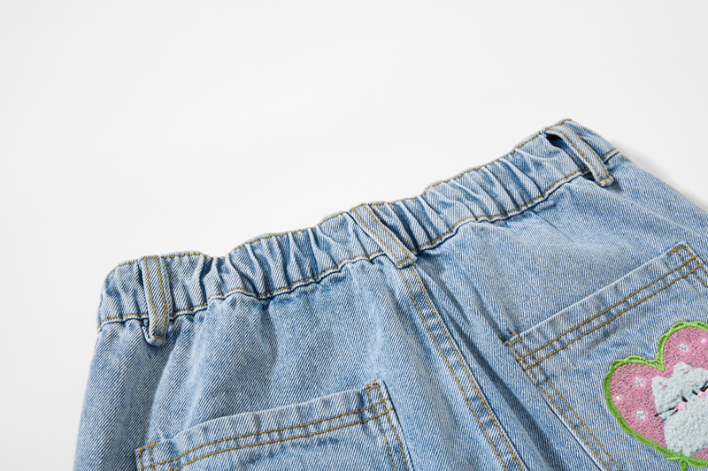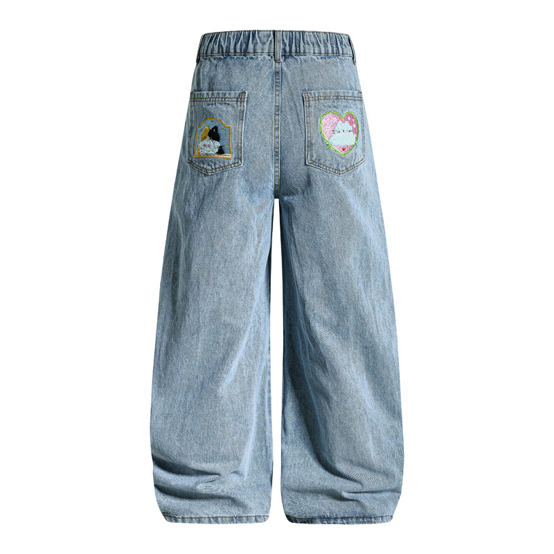 Retro Cartoon Embroidery Denim Pants, Unisex Streetwear Loose Fit Couple Casual Versatile Wide Leg Long Pants