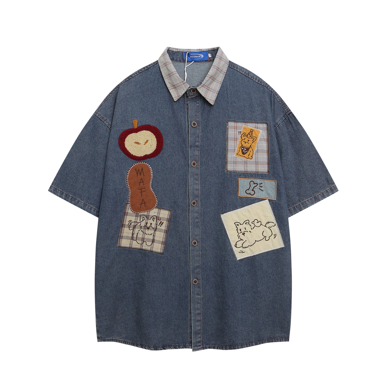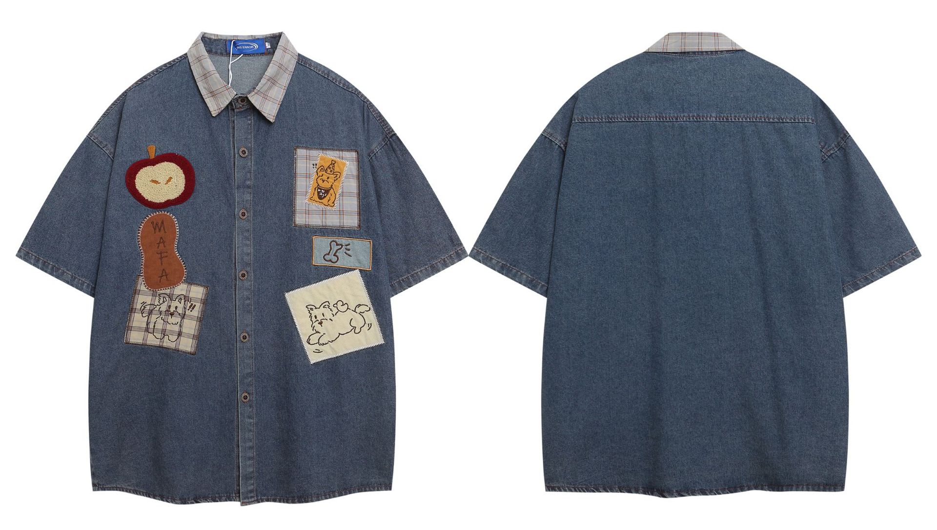 Retro Dog Embroidery Splicing Turn-Down Collar Denim Short Sleeve Shirt For Men Ands Women