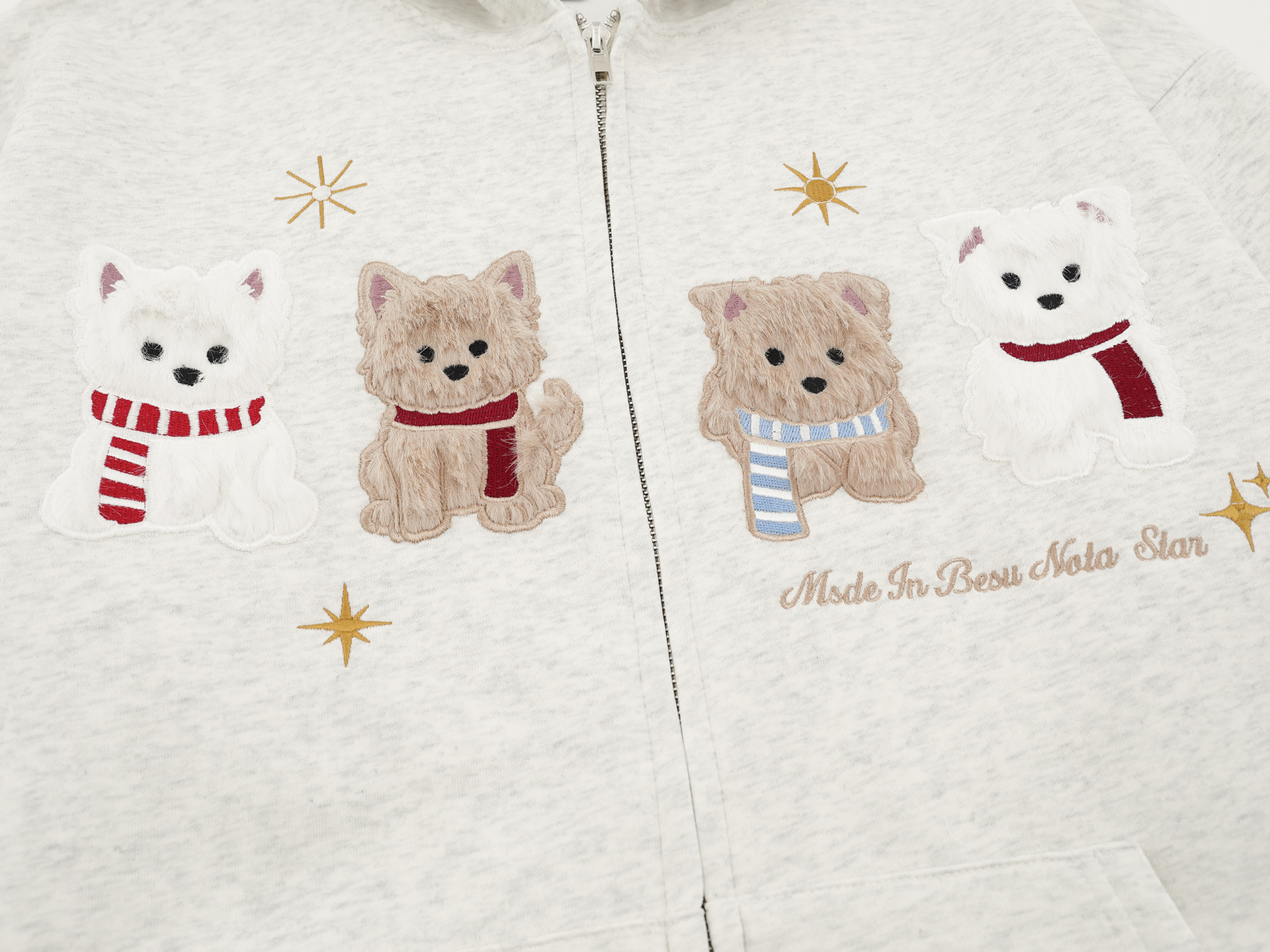 Details: Embroidery, Flocking