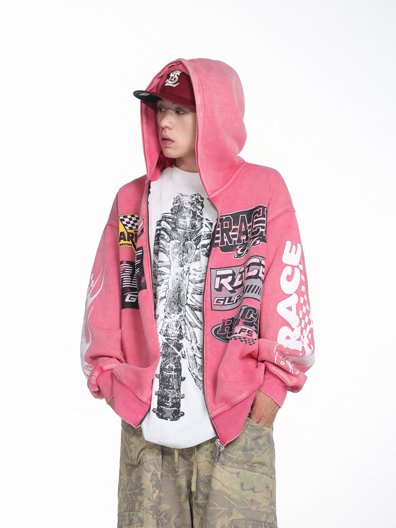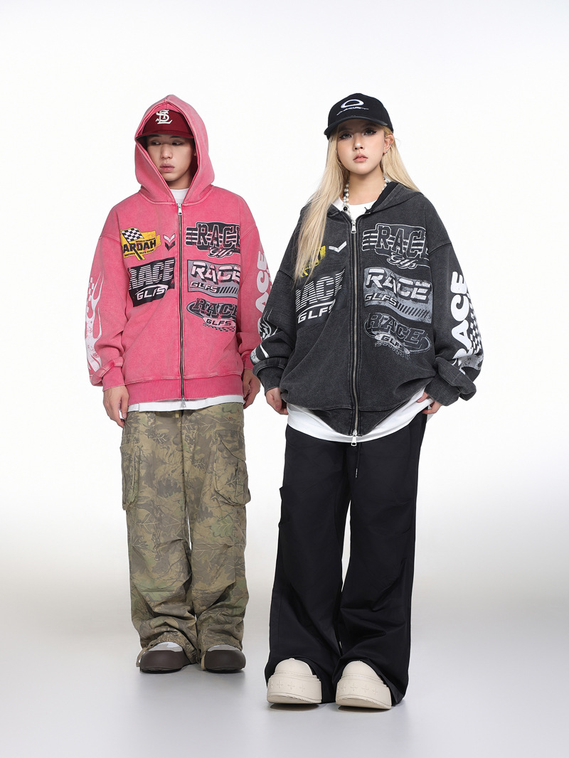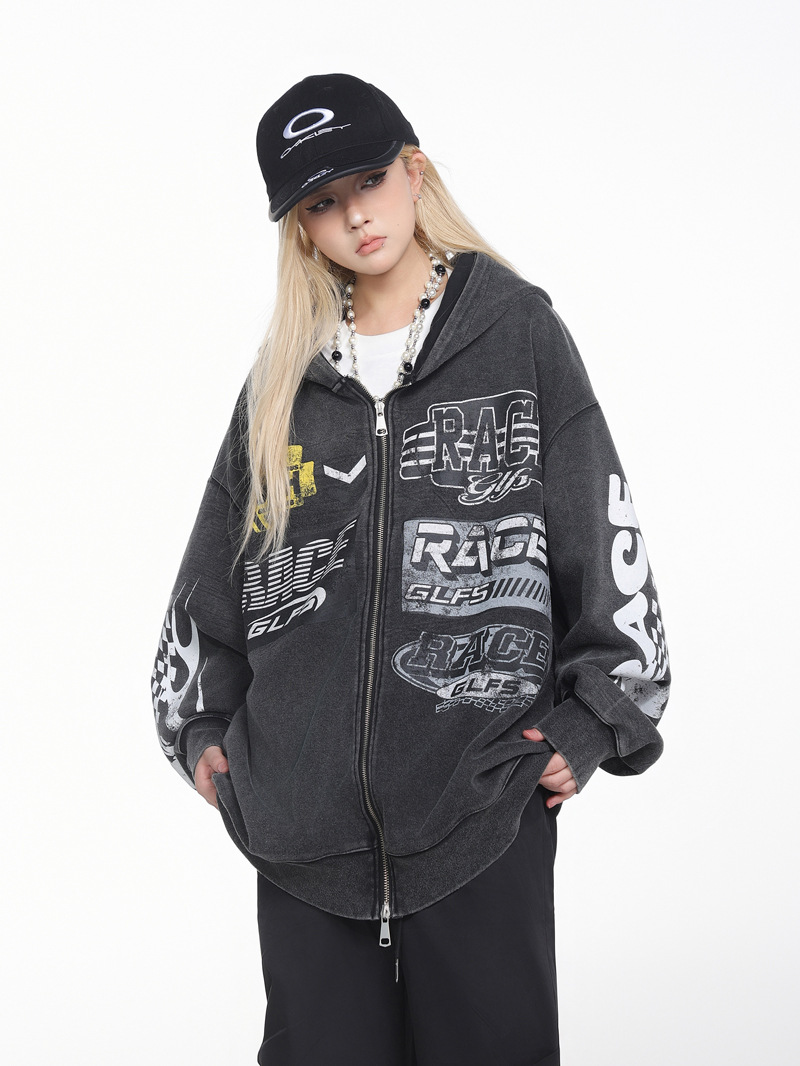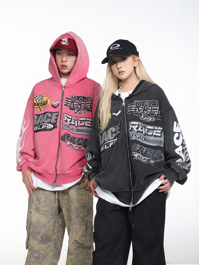 Retro Racing Slogan Washed Zip-Up Hoodie, Unisex Casual Oversized Couple Hooded Sweatshirt Jacket