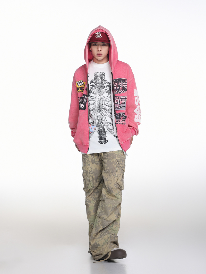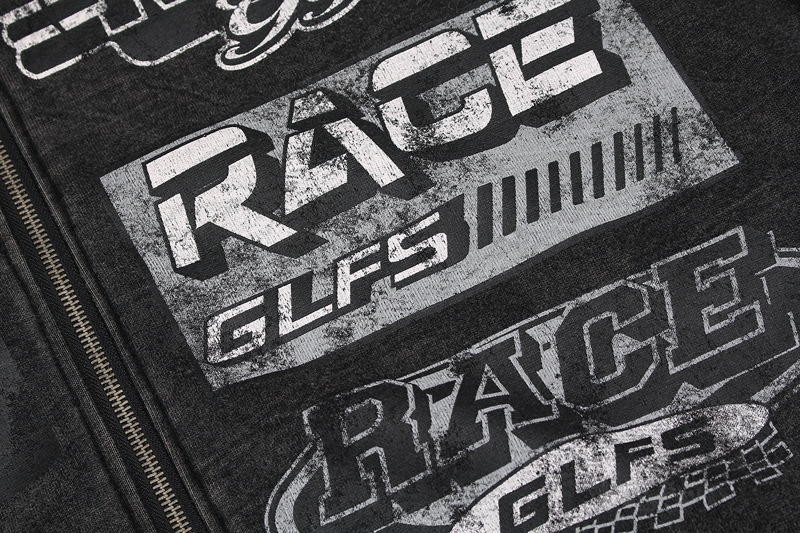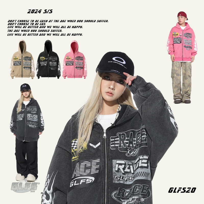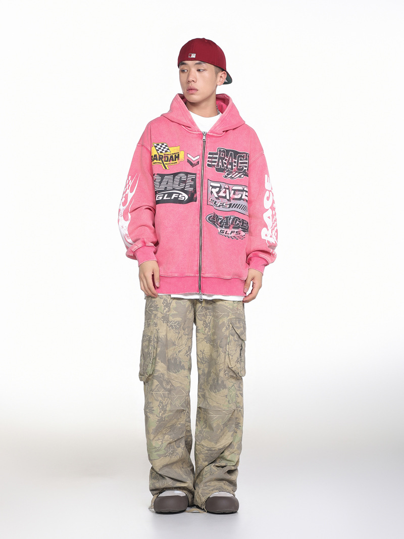 Retro Racing Slogan Washed Zip-Up Hoodie, Unisex Casual Oversized Couple Hooded Sweatshirt Jacket