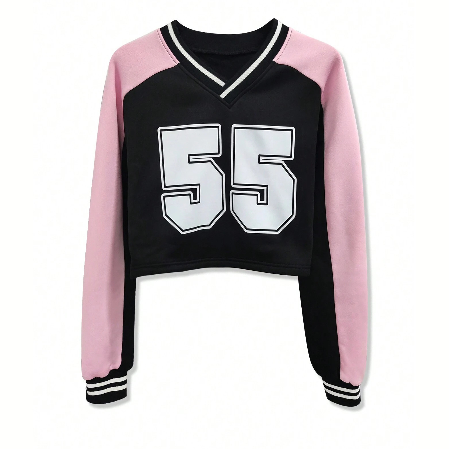 Sports Wind Baseball Jacket Printed V-neck Loose Color-blocking Long-sleeve Versatile Sweatshirt