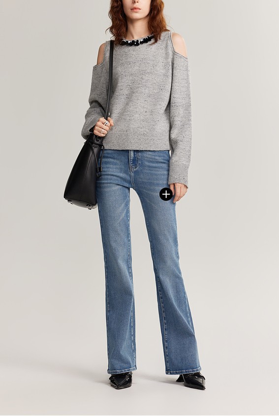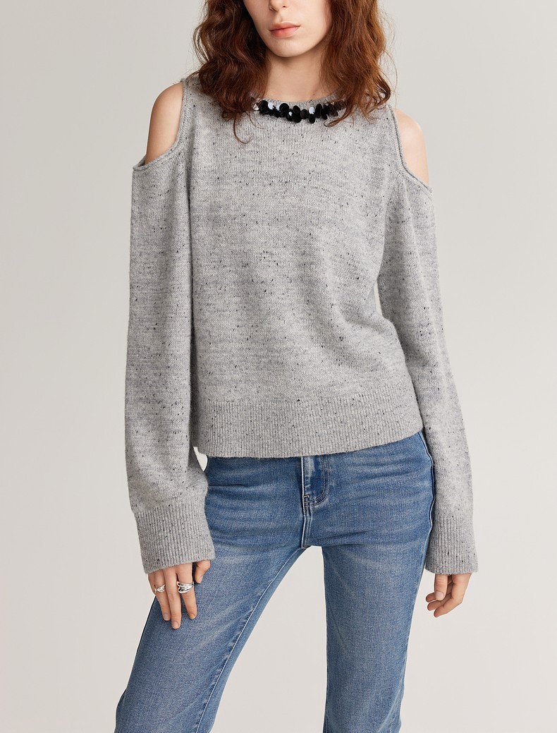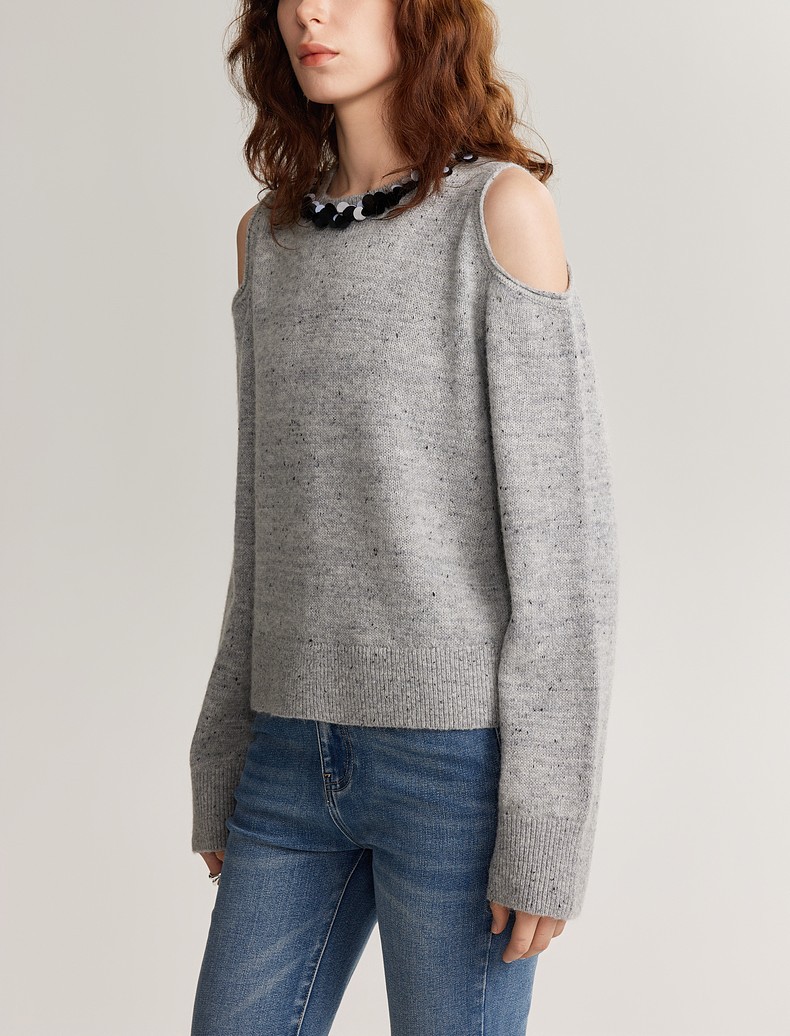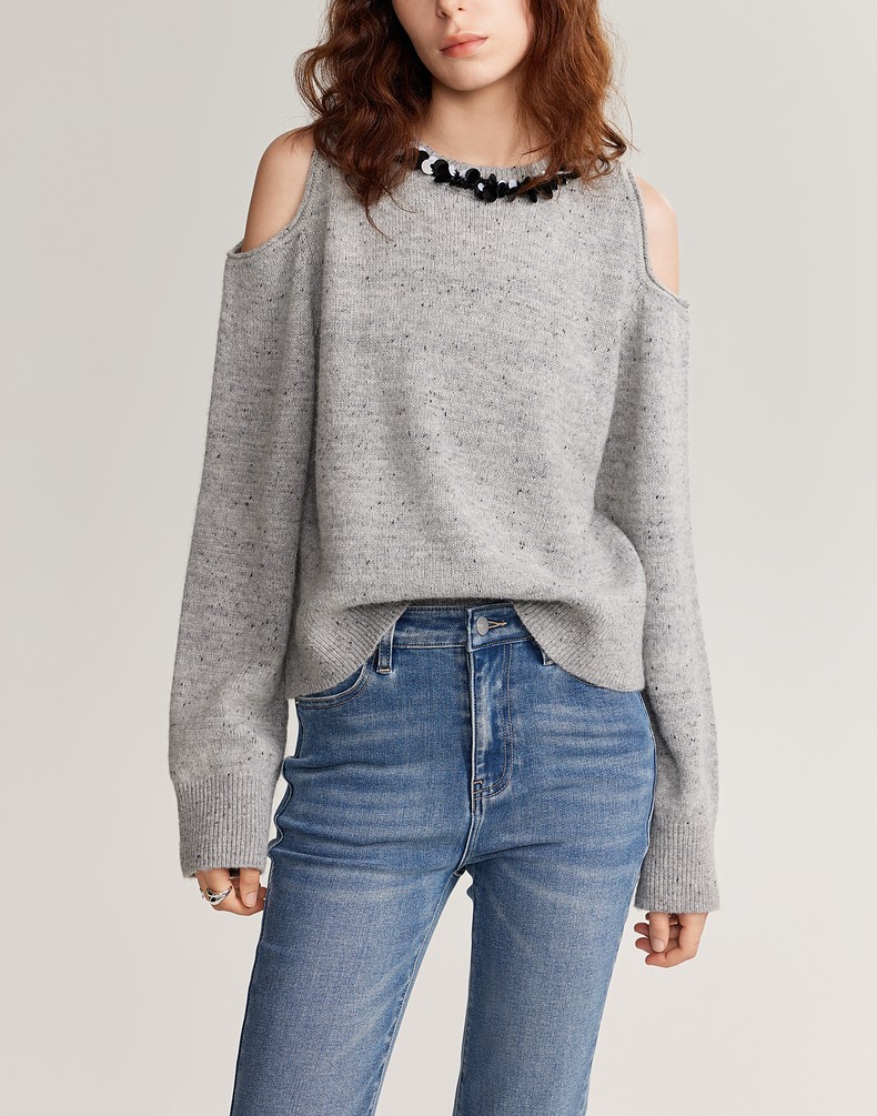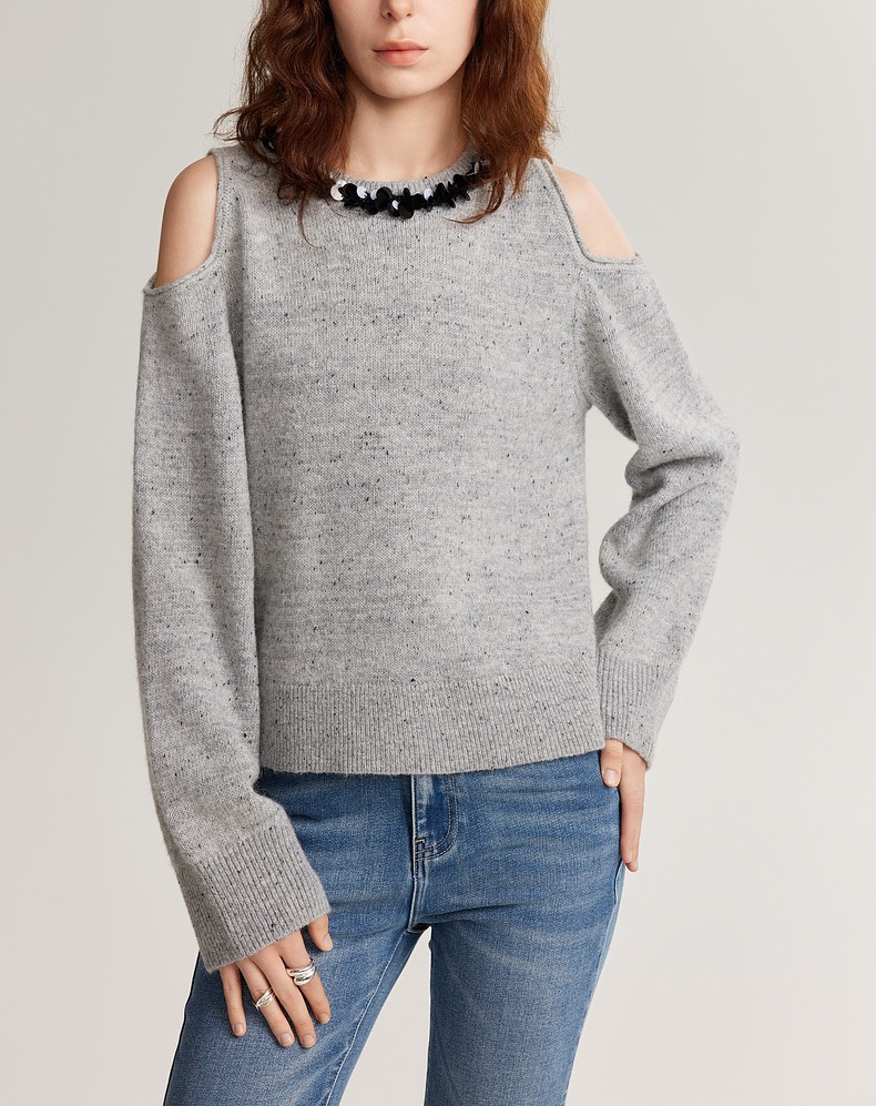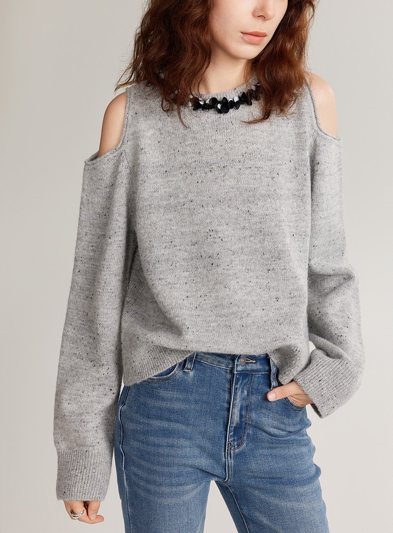 灰色绵羊毛马海毛混纺毛针织衫女2025秋季新款宽松露肩毛衣